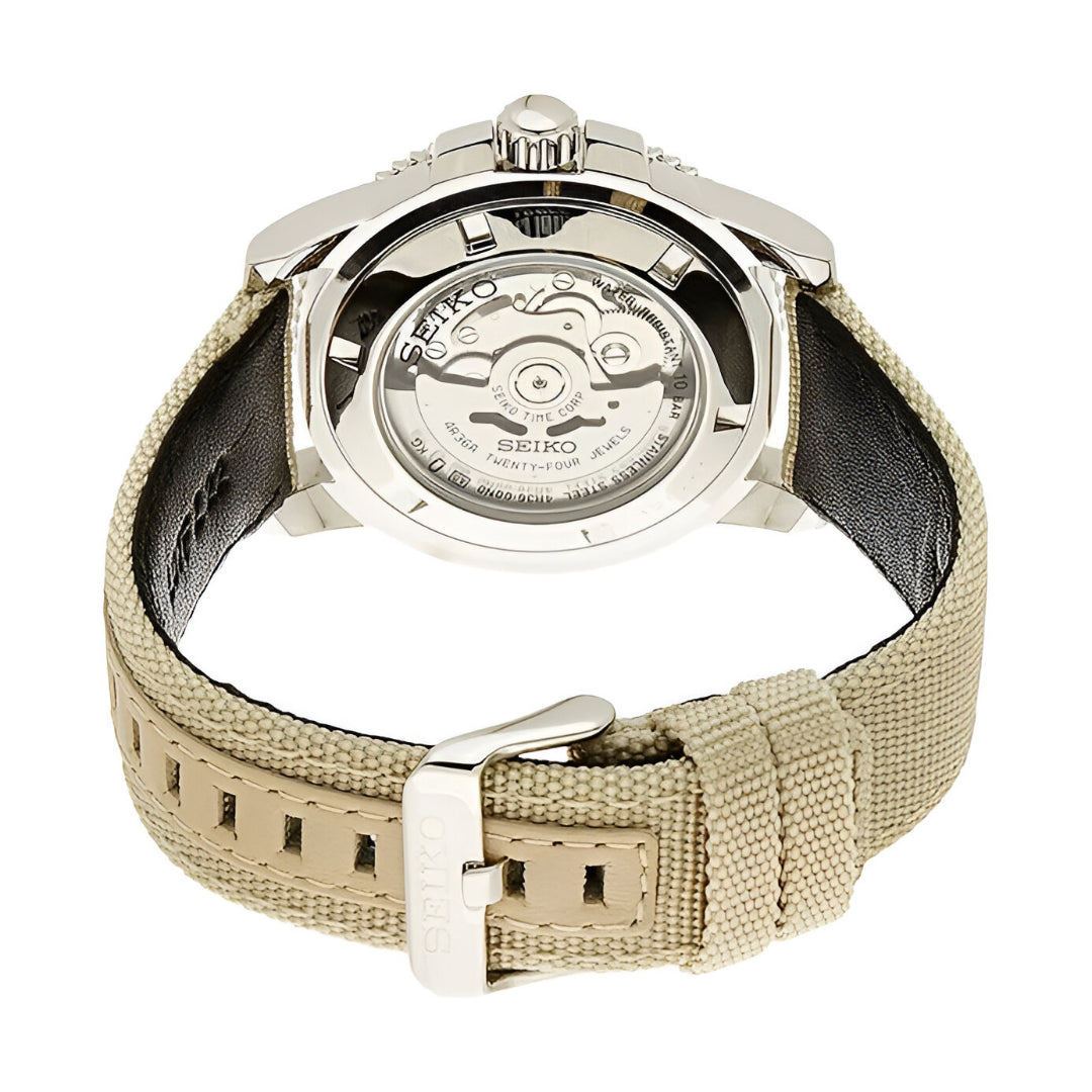SRP221K2 cocok bagi Anda yang mencari jam tangan otomatis dengan tampilan tangguh, gaya kasual-militer, dan daya tahan tinggi dengan sentuhan fleksibel dari strap fabric.
