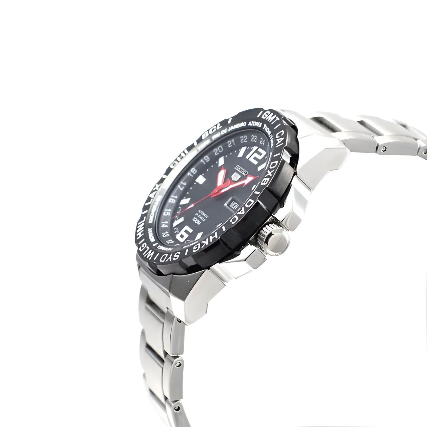Jam ini menggunakan movement otomatis kaliber 4R36 yang mendukung manual winding dan fitur stop-second, dengan cadangan daya sekitar 41 jam. Display day-date di posisi pukul 3 menambah aspek praktis sebagai jam sehari-hari. Bezel bergaya world-time memberi sentuhan travel utility sekaligus memperkuat kesan tool-watch.