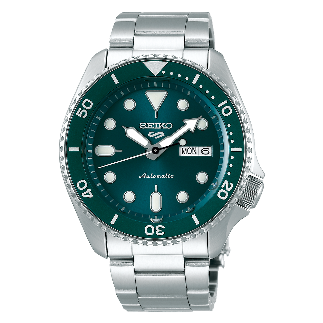 - Unidirectional rotating stainless steel green colored bezel and silver tone stainless steel bracelet
