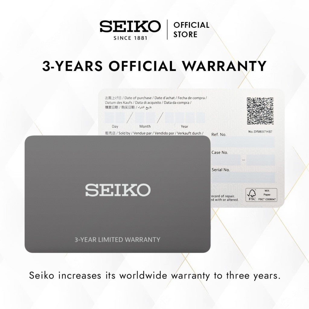 Mulai 1 Oktober 2024, garansi Seiko yang sebelumnya 1 tahun kini diperpanjang menjadi 3 tahun. Garansi ini berlaku untuk mesin jam, namun tidak mencakup strap, tali, sparepart, Case yang lecet atau gompal, serta kaca pecah.